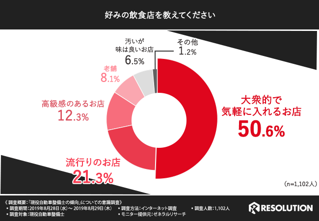 「好みの飲食店を教えてください」と質問したところ、半数の方が「大衆的で気軽に入れるお店」と回答されました。
